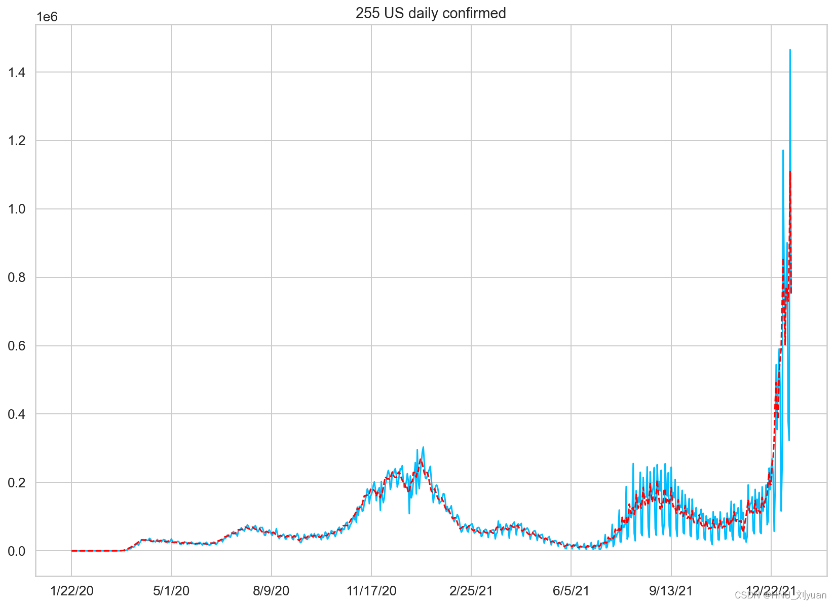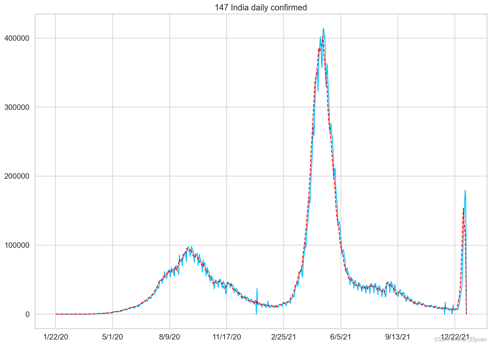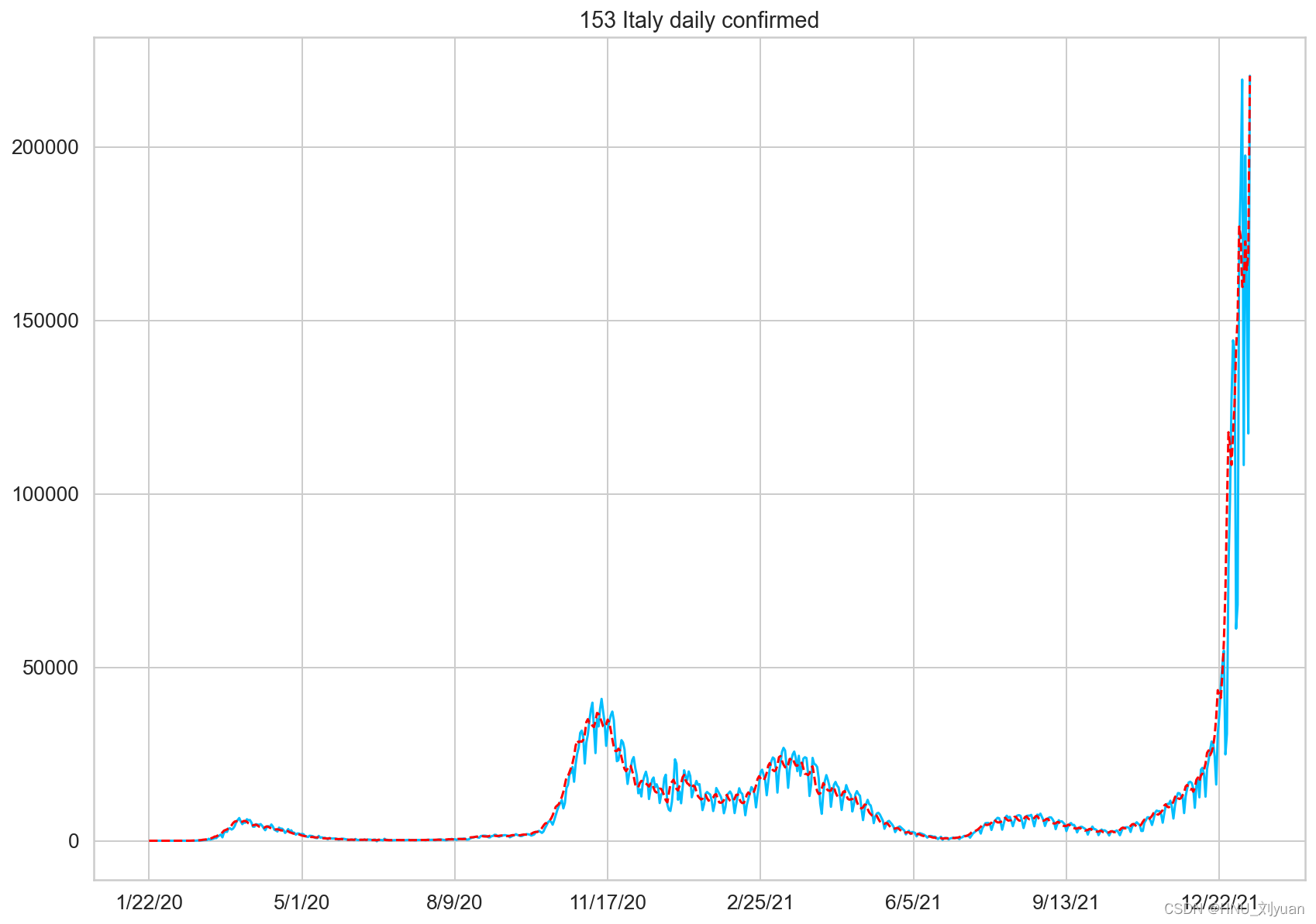 其中蓝线为每日新增人数,红线为平滑后的数值。可以看出,每日新增的数据是震荡的,不那么平滑,并且可能存在好几个峰值。对于大部分国家而言,在2021年底新增确诊人数都有一个较大的提升,推测应该是由于变异病毒奥密克戎的影响,传染率更高 。