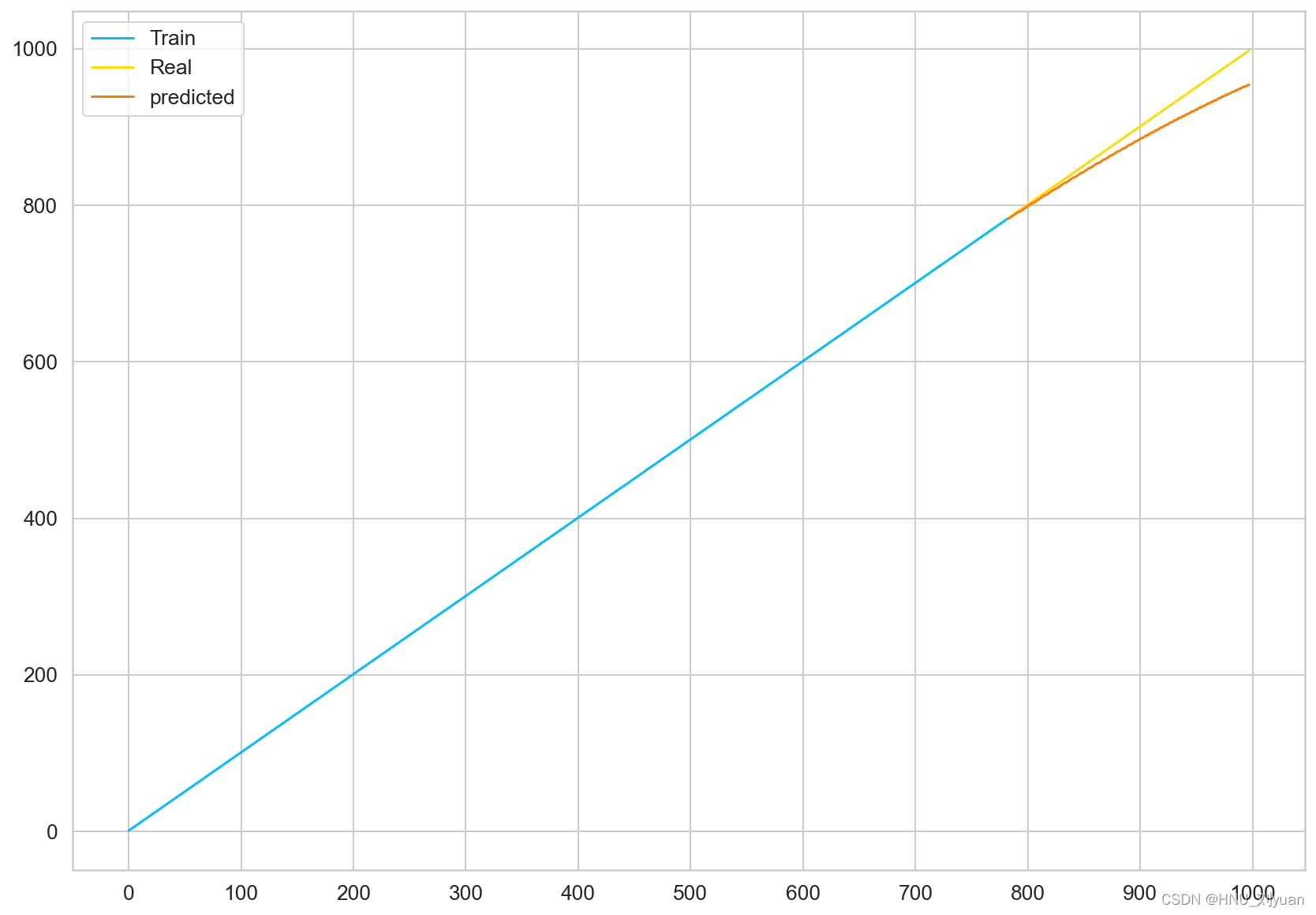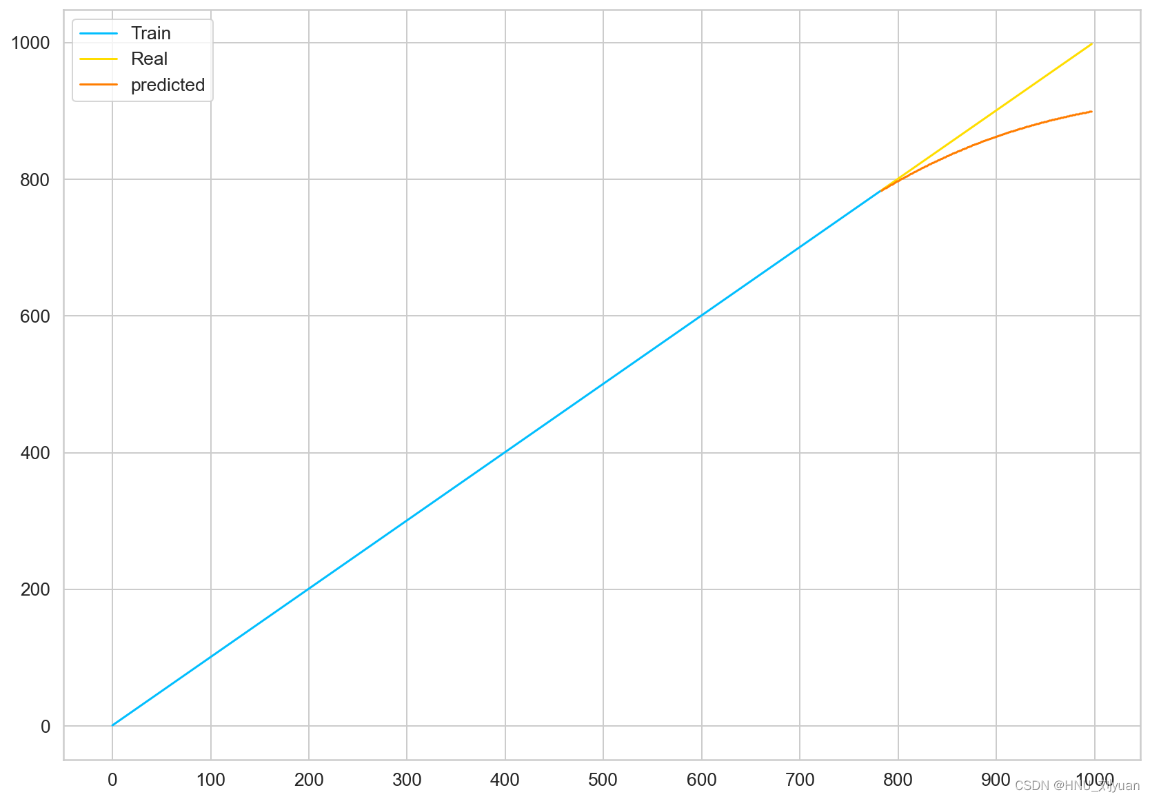 自己生成1-1000的线型数据,作为测试,划分不同比例的数据作为训练集和测试集,探究seq_length对拟合数据的影响。固定测试集的比例为0.3,当seq_length为5时,即使用5个数据预测下一数据,预测的数据作为输入再预测下一个数据 。得到: