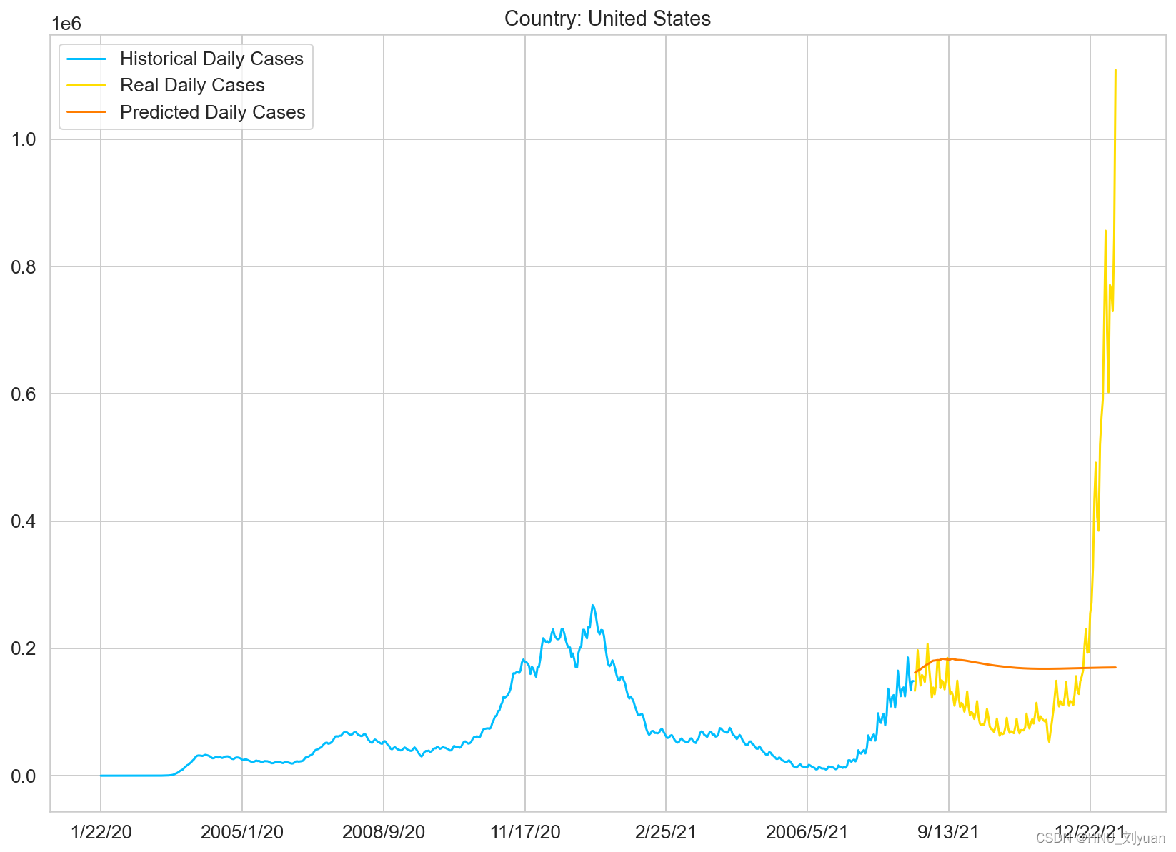 从预测结果可以看出模型并不能够很好的预测美国未来单日新增人数,因为病毒是在变异的,后面的传染性更强,这些信息是无法从之前的序列数据中推测出来,所以由于美国没有很好的进行抗疫,任由病毒发展,加上病毒的变异,所以两种模型都不能够很好的预测出来未来的走势。