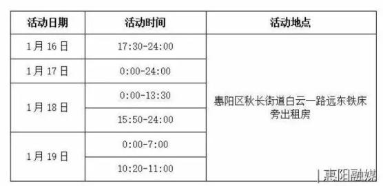 1月19日,惠阳区疫情防控指挥部办公室发布通告 ,根据深圳新冠肺炎阳性检测者的密切接触者在我区活动轨迹的排查情况,如在以下时间段有到过相关区域活动的人员,请按相应要求自觉落实防控措施并尽快开展1次核酸检测。