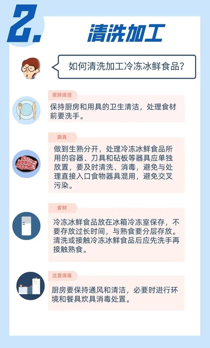 四、市民要增强个人防护意识。选购冷冻食品时,避免手直接触碰冷冻食品及其包装。购买冷冻食品回家后,对冷冻食品包装表面进行消毒 。储存此类物品前,做好独立封闭包装。接触和处理完冷冻食品后,立即洗手消毒。